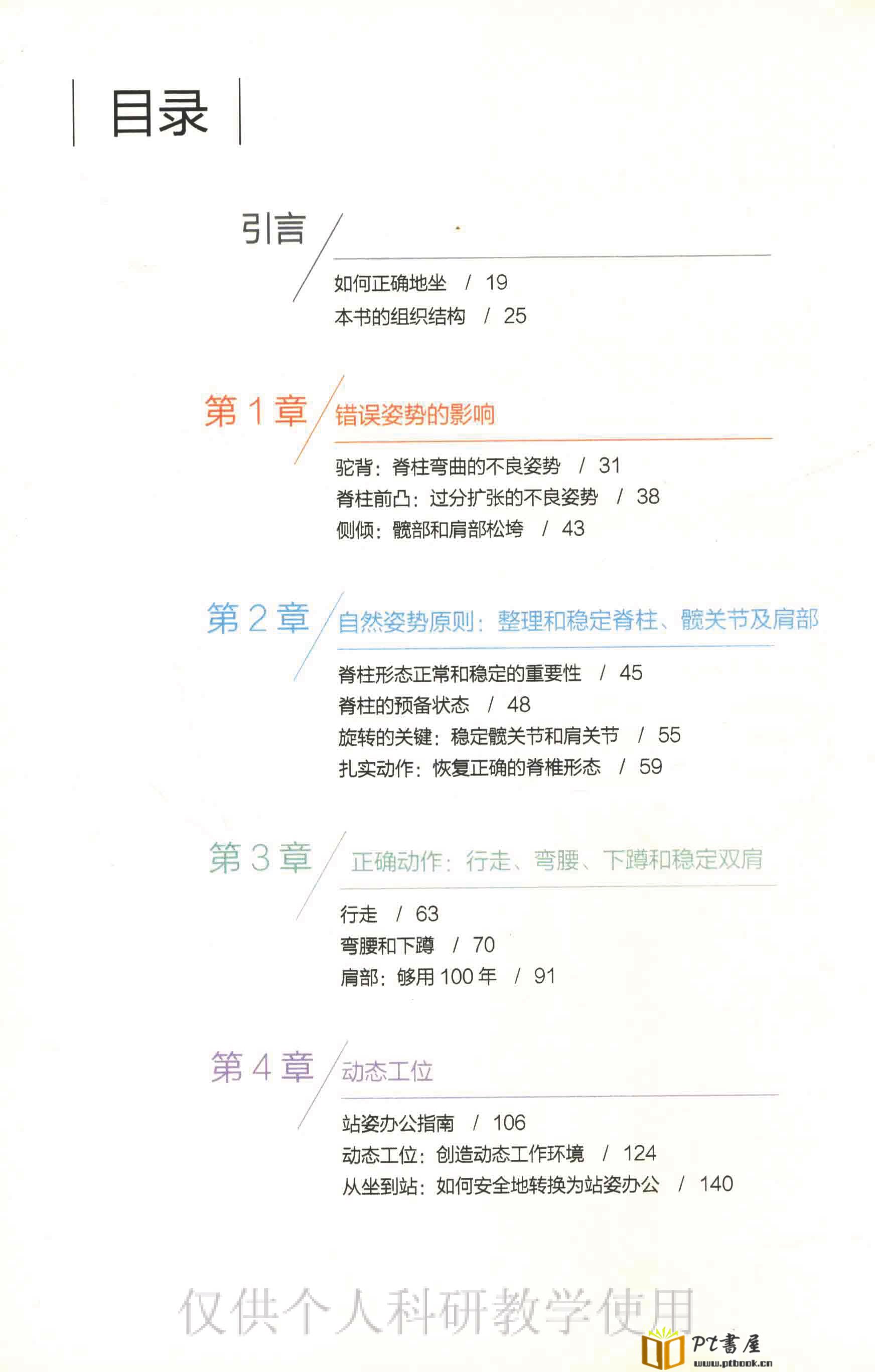 内容提要:目前越来越多的人加入到健身行列之中,希望通过科学锻炼和健康饮食来保持身体的强健。然而有关研究表明,即使你每天能够坚持锻炼1小时,但其他大部分时间都以不良姿势坐着学习或者办公,那么健身所带来的益处就会被抵消,更何况你还是个不怎么运动的人。在本书中,著名物理治疗师、畅销书作者凯利·斯塔雷特博士和他的合作者针对这一现代社会的普遍现象,在多年实践的基础上介绍了一套以恢复和保持人体自然姿势为目标的健身运动方法。本方法简单易学,无需专业健身设施和器材,每天只需投入10~15分钟时间,即可缓解或避免不良姿势所导致的身体不适以及机能受阻等问题。更为重要的是,只有将本书所介绍的原则和措施应用到生活中,才能保证采用其他方式所进行的健身训练取得应有的效果。不论你是专业运动员、健身爱好者还是需要久坐办公的上班族,本书都可以帮助你有效应对困扰已久的问题。本书也可以指导家长解决学龄阶段的孩子所遇到的体态变性、身体机能下降等健康问题。