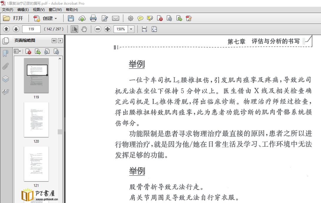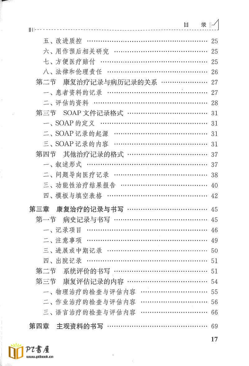 内容提要: 本书共分十章,从治疗师们熟悉的物理治疗、作业治疗、吞咽、语言治疗程序入手,旨在阐述康复治疗记录是康复治疗程序中必要环节;在介绍了基本概念,常用记录格式等内容后,在国外各类治疗师普通采用的SOAP格式书写则用了大量篇幅叙述。